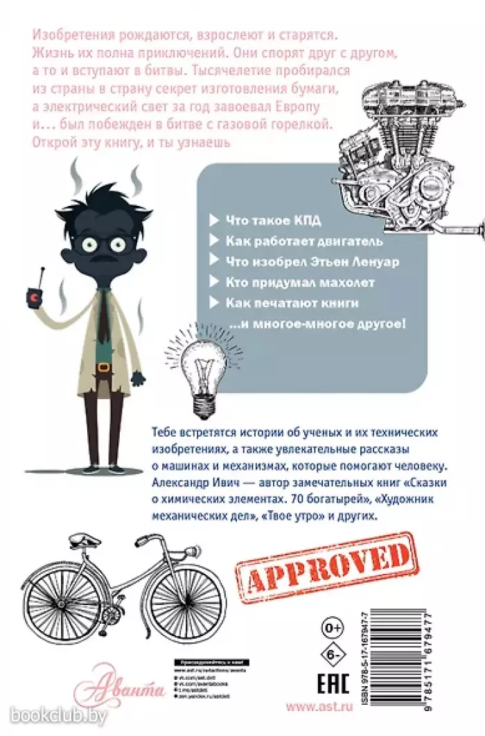 Изобретения рождаются, взрослеют и старятся. Жизнь их полна приключений. Они спорят друг с другом, а то и вступают в битвы. Тысячелетие пробирался из страны в страну секрет изготовления бумаги, а электрический свет за год завоевал Европу и... был побеждён в битве с газовой горелкой. Книга Александра Ивича "Приключения изобретений" познакомит читателя с удивительными машинами и механизмами, которые помогают человеку, а также с изобретателями этих механизмов. Александр Ивич – автор замечательных книг "Сказки о химических элементах. 70 богатырей", "Художник механических дел", "Твое утро" и других.