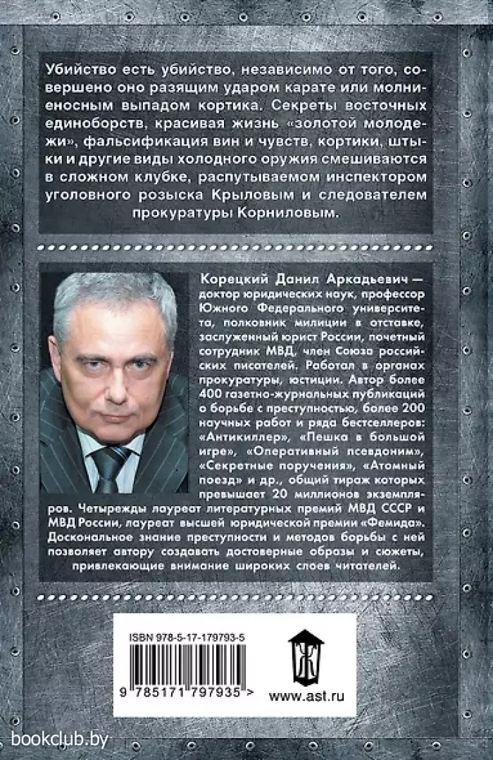 – Данил Корецкий — доктор юридических наук, профессор, полковник милиции в отставке. Автор более 200 научных работ и бестселлеров «Антикиллер», «Пешка в большой игре», «Оперативный псевдоним» и др. тиражом 20+ миллионов экземпляров. Четырежды лауреат литературных премий МВД СССР и МВД России, лауреат премии «Фемида».