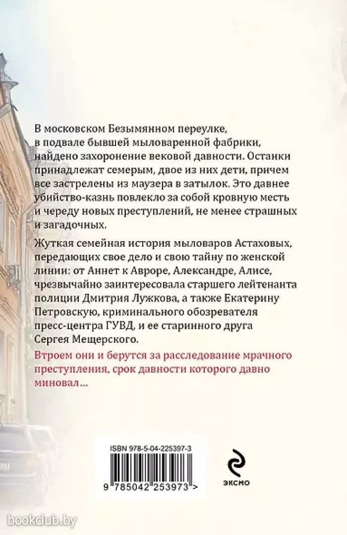 В московском Безымянном переулке, в подвале бывшей мыловаренной фабрики, найдено захоронение вековой давности. Останки принадлежат семерым, двое из них дети, причем все застрелены из маузера в затылок. Это давнее убийство-казнь повлекло за собой кровную месть и череду новых преступлений, не менее страшных и загадочных. Жуткая семейная история мыловаров Астаховых, передающих свое дело и свою тайну по женской линии: от Аннет к Авроре, Александре, Алисе, чрезвычайно заинтересовала старшего лейтенанта полиции Дмитрия Лужкова, а также Екатерину Петровскую, криминального обозревателя Пресс-центра ГУВД, и ее старинного друга Сергея Мещерского. Втроем они и берутся за расследование мрачного преступления, срок давности которого давно миновал…