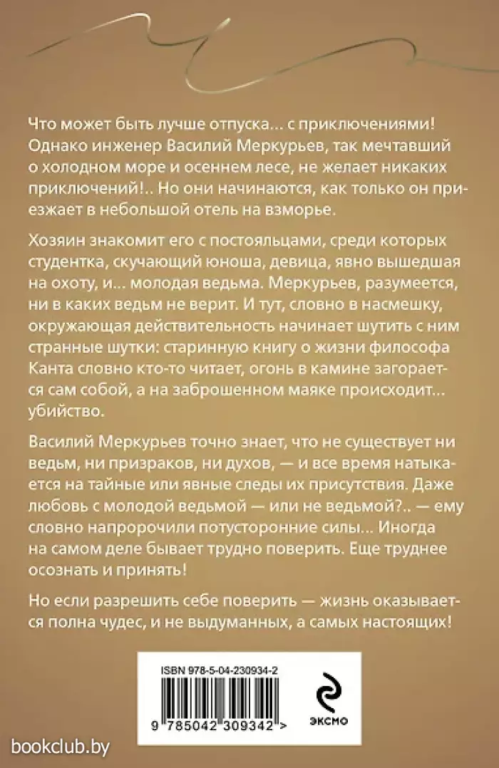 Что может быть лучше отпуска... с приключениями! Однако инженер Василий Меркурьев, так мечтавший о холодном море и осеннем лесе, не желает никаких приключений!.. Но они начинаются, как только он приезжает в небольшой отель на взморье. Хозяин знакомит его с постояльцами, среди которых студентка, скучающий юноша, девица, явно вышедшая на охоту, и... молодая ведьма. Меркурьев, разумеется, ни в каких ведьм не верит. И тут словно в насмешку окружающая действительность начинает шутить с ним странные шутки: старинную книгу о жизни философа Канта словно кто-то читает, огонь в камине загорается сам собой, а на заброшенном маяке происходит... убийство. Василий Меркурьев точно знает, что не существует ни ведьм, ни призраков, ни духов — и все время натыкается на тайные или явные следы их присутствия. Даже любовь с молодой ведьмой — или не ведьмой?.. — ему словно напророчили потусторонние силы... Иногда на самом деле бывает трудно поверить. Еще труднее осознать и принять! Но если разрешить себе поверить — жизнь оказывается полна чудес, и не выдуманных, а самых настоящих!