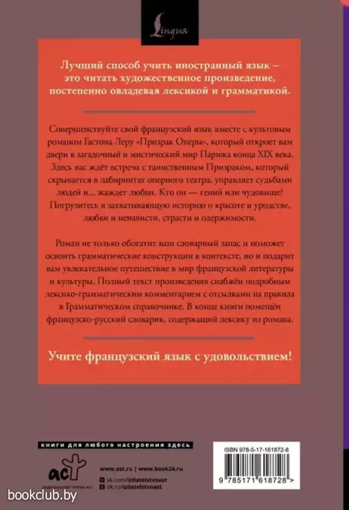 Лучший способ учить иностранный язык – это читать художественное произведение, постепенно овладевая лексикой и грамматикой. Совершенствуйте свой французский язык вместе с культовым романом Гастона Леру «Призрак Оперы», который откроет вам двери в загадочный и мистический мир Парижа конца XIX века. Здесь вас ждёт встреча с загадочным Призраком, который скрывается в лабиринтах оперного театра, управляет судьбами людей и... жаждет любви. Кто он — гений или чудовище? Погрузитесь в захватывающую историю о красоте и уродстве, любви и ненависти, страсти и одержимости. Роман не только обогатит ваш словарный запас и поможет освоить грамматические конструкции в контексте, но и подарит вам увлекательное путешествие в мир французской литературы и культуры. Полный текст произведения снабжён подробным лексико-грамматическим комментарием с отсылками на правила в Грамматическом справочнике. В конце книги помещён французско-русский словарик, содержащий лексику из романа. Издание предназначено для всех, кто учит французский язык и стремится читать книги на языке оригинала.