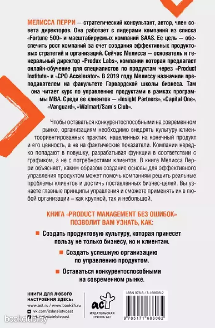 МЕЛИССА ПЕРРИ — стратегический консультант, автор, член совета директоров. Она работает с лидерами компаний из списка «Fortune 500» и масштабируемых компаний SAAS. Ее цель — обеспечить рост компаний за счет создания эффективных продуктовых стратегий и организаций. Сейчас Мелисса — основатель и генеральный директор «Produx Labs», компании которая предлагает онлайн-обучение для специалистов по продуктам через «Product Institute» и «CPO Accelerator». В 2019 году Мелиссу назначили преподавателем на факультете Гарвардской школы бизнеса. Там она читает курс по управлению продуктами в рамках программы MBA. Среди ее клиентов — «Insight Partners», «Capital One», «Vanguard», «Walmart/Sam’s Club». Чтобы оставаться конкурентоспособными на современном рынке, организациям необходимо внедрять культуру клиентоориентированных практик, нацеленных на конечный продукт и его ценность, а не на фактические показатели. Компании нередко попадают в ловушку, разрабатывая функции в соответствии с графиком, а не с потребностями клиентов. Понимая, как правильно взаимодействовать в рамках структуры компании, вы сможете создать продуктовую культуру, которая принесет пользу не только бизнесу, но и клиентам. Вы узнаете главные принципы управления и сможете применять их в любой организации – как крупной, так и небольшой. Книга «Product Management без ошибок» позволит вам узнать, как: - Создать продуктовую культуру, которая принесет пользу не только бизнесу, но и клиентам. - Создать успешную организацию по управлению продуктом. - Оставаться конкурентоспособными на современном рынке.