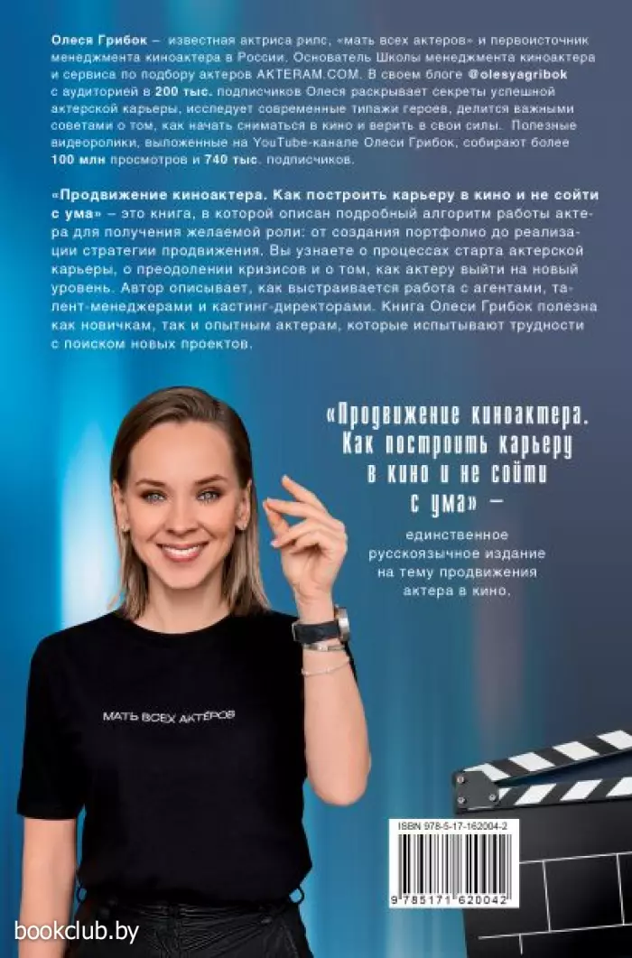 "Продвижение киноактера. Как построить карьеру в кино и не сойти с ума" – это книга, в которой описан подробный алгоритм работы актера для получения желаемой роли: от создания портфолио до реализации стратегии продвижения. Вы узнаете о процессах старта актерской карьеры, о преодолении кризисов и о том, как актеру выйти на новый уровень. Автор описывает, как выстраивается работа с агентами, талент-менеджерами и кастинг-директорами. Книга Олеси Грибок полезна как новичкам, так и опытным актерам, которые испытывают трудности с поиском новых проектов.