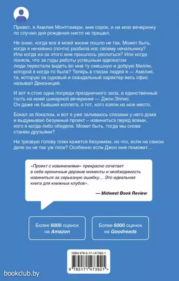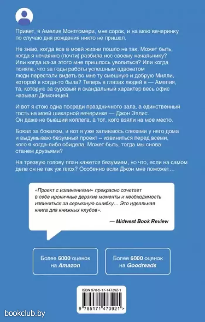 Привет, я Амелия Монтгомери, мне сорок, и на мою вечеринку по случаю дня рождения никто не пришел. Не знаю, когда все в моей жизни пошло не так. Может быть, когда я нечаянно (почти) разбила нос своему начальнику? Или когда из-за этого мне пришлось уволиться? Или когда я поняла, что за годы работы успешным адвокатом люди перестали видеть во мне ту смешную и добрую Милли, которой я когда-то была? Теперь в глазах людей я — Амелия, та, которую за суровый и скандальный характер весь офис называл Демоницей. И вот я стою одна посреди праздничного зала, а единственный гость на моей шикарной вечеринке — Джон Эллис. Он даже не бывший коллега, а тот, кого взяли на мое место. Бокал за бокалом, и вот я уже заливаюсь слезами у него дома и выдумываю безумный проект – извиниться перед всеми, кого я когда-либо обидела. Может быть, тогда мы снова станем друзьями? На трезвую голову план кажется безумием, но что, если на самом деле он не так уж плох? Особенно если Джон мне поможет… "Проект с извинениями" прекрасно сочетает в себе ироничные дерзкие моменты и необходимость извиниться за серьезную ошибку… Это идеальная книга для книжных клубов". — Midwest Book Review