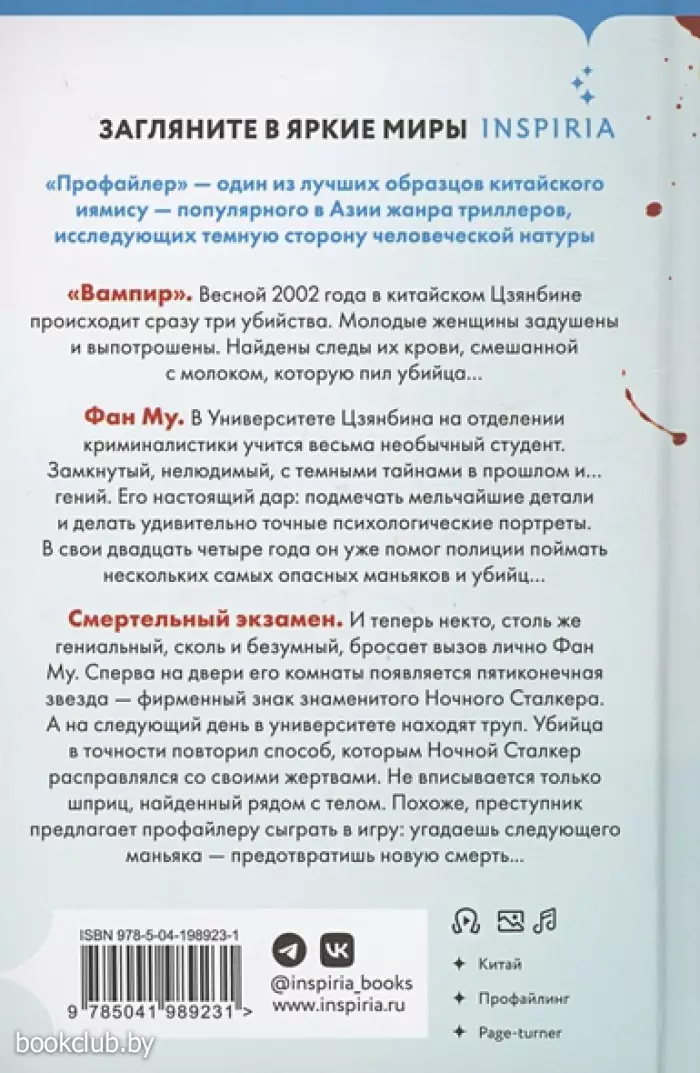 Смертельный экзамен. И теперь некто столь же гениальный, сколь и безумный, бросает вызов лично Фан Му. Сперва на двери его комнаты появляется пятиконечная звезда – фирменный знак знаменитого Ночного Сталкера. А на следующий день в Университете находят труп. Убийца в точности повторил способ, которым Ночной Сталкер расправлялся со своими жертвами. Не вписывается только шприц, найденный рядом с телом. Похоже, преступник предлагает профайлеру сыграть в игру: угадаешь следующего маньяка - предотвратишь новую смерть...
