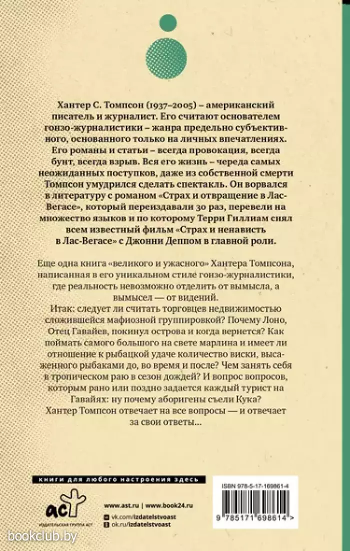 Еще одна книга «великого и ужасного» Хантера Томпсона, написанная в его уникальном стиле гонзо-журналистики, где реальность невозможно отделить от вымысла, а вымысел — от видений. Итак: следует ли считать торговцев недвижимостью сложившейся мафиозной группировкой? Почему Лоно, Отец Гавайев, покинул острова — и когда вернется? Как поймать самого большого на свете марлина, и имеет ли отношение к рыбацкой удаче количество виски, высаженного рыбаками до, во время и после? Чем занять себя в тропическом раю в сезон дождей? И вопрос вопросов, которым рано или поздно задается каждый турист на Гавайях: ну почему аборигены съели Кука? Хантер Томпсон отвечает на все вопросы — и отвечает за свои ответы...