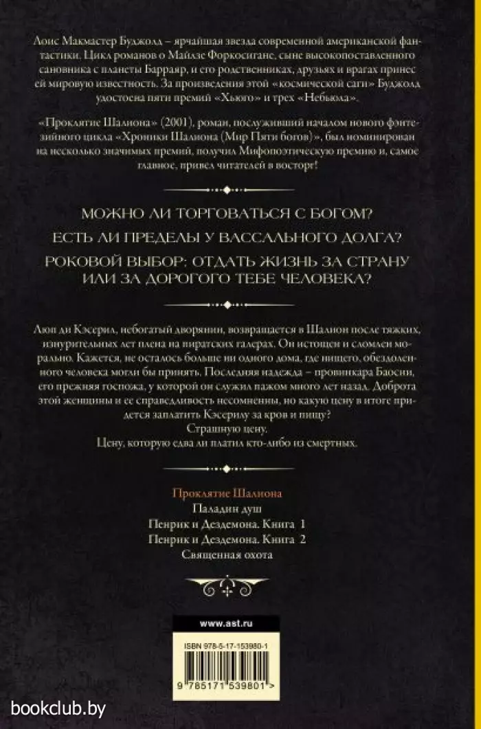 Люп ди Кэсерил, небогатый дворянин, возвращается в Шалион после тяжких, изнурительных лет плена на пиратских галерах. Он истощен и сломлен морально. Кажется, не осталось больше ни одного дома, где нищего обездоленного человека могли бы принять. Последняя надежда – провинкара Баосии, его прежняя госпожа, у которой он служил пажом много лет назад. Доброта этой женщины и ее справедливость несомненны, но какую цену в итоге придется заплатить Кэсерилу за кров и пищу?