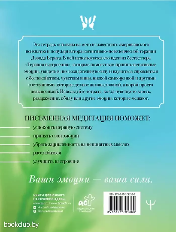 Эта тетрадь основана на методе известного американского психиатра, популяризатора теории когнитивно-поведенческой терапии, Дэвида Бернса. В основу тетради легли идеи бестселлера Бернса "Терапия настроения", которые помогут вам принять негативные эмоции, увидеть в них созидательную силу и научиться справляться с беспокойством, чувством вины, низкой самооценкой и другими состояниями, которые делают жизнь сложной, а порой и невыносимой.