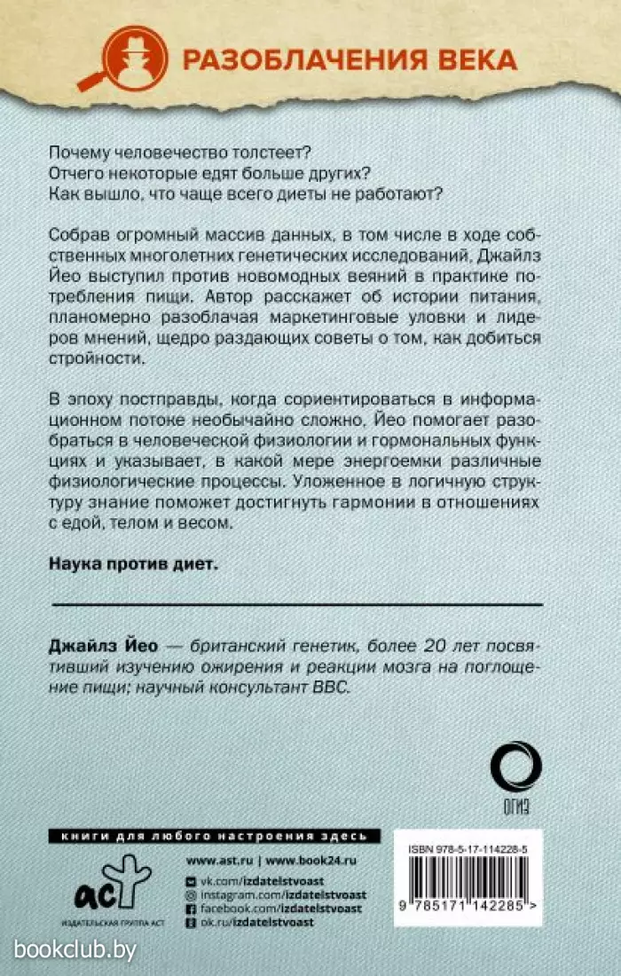 Почему человечество толстеет? Отчего некоторые едят больше других? Как вышло, что чаще всего диеты не работают? Собрав огромный массив данных, в том числе в ходе собственных многолетних генетических исследований, Джайлз Йео выступил против новомодных веяний в практике потребления пищи. Автор расскажет об истории питания, планомерно разоблачая маркетинговые уловки и лидеров мнений, щедро раздающих советы о том, как добиться стройности.