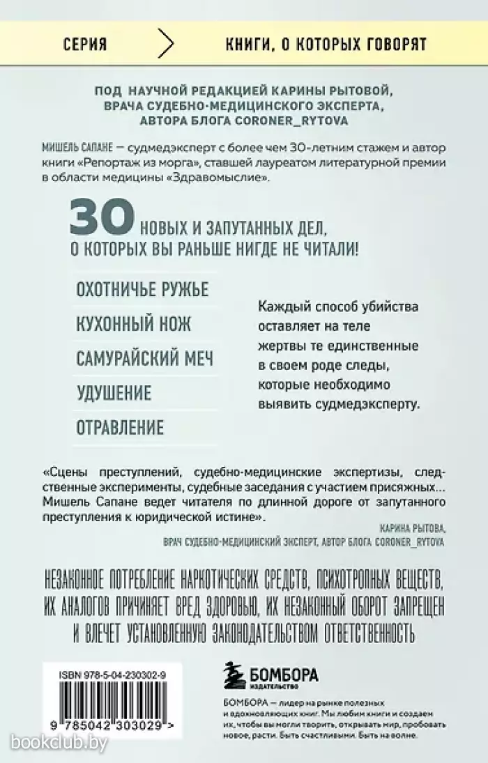 «Сцены преступлений, судебно-медицинские экспертизы, следственные эксперименты, судебные заседания с участием присяжных... Мишель Сапане ведет читателя по длинной дороге от запутанного преступления к юридической истине». — Карина Рытова, врач, судебно-медицинский эксперт, автор блога coroner_rytova