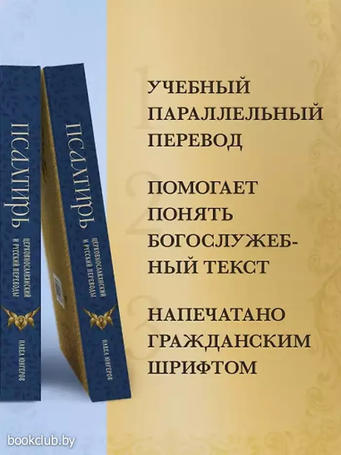 Псалтирь на церковно-славянском языке с параллельным переводом на русский язык, выполненный выдающимся русским ученым П.А. Юнгеровым. Перевод получил одобрение Священного Синода в 1876 г. Вновь начал издаваться по благословению Святейшего Патриарха Алексия II.