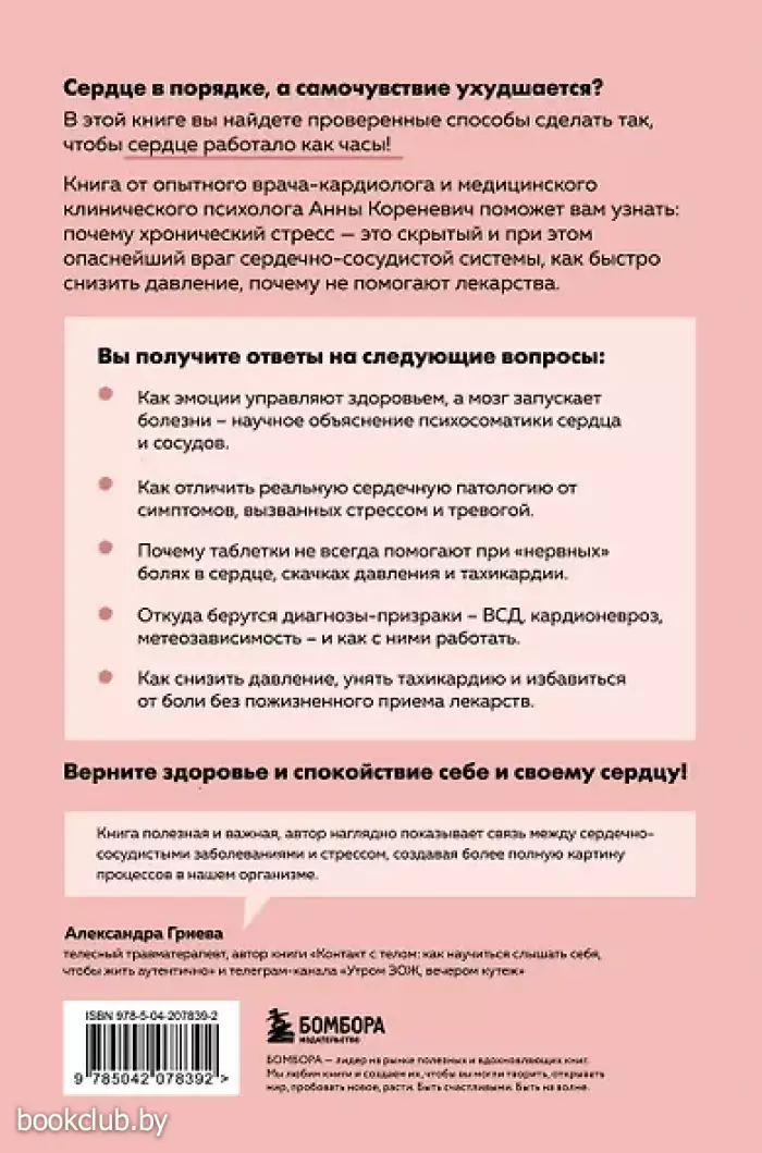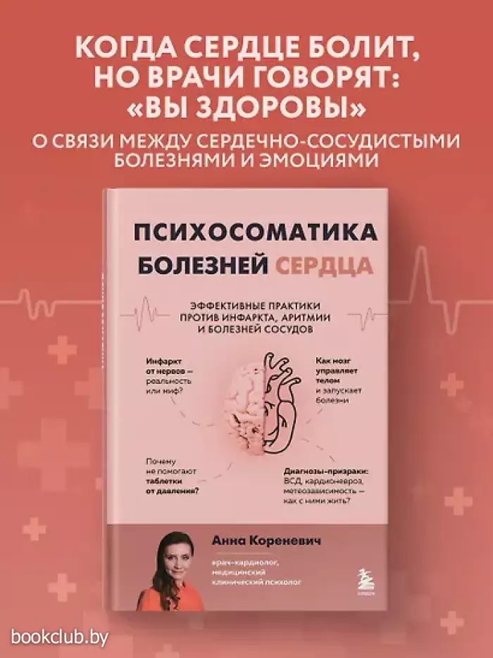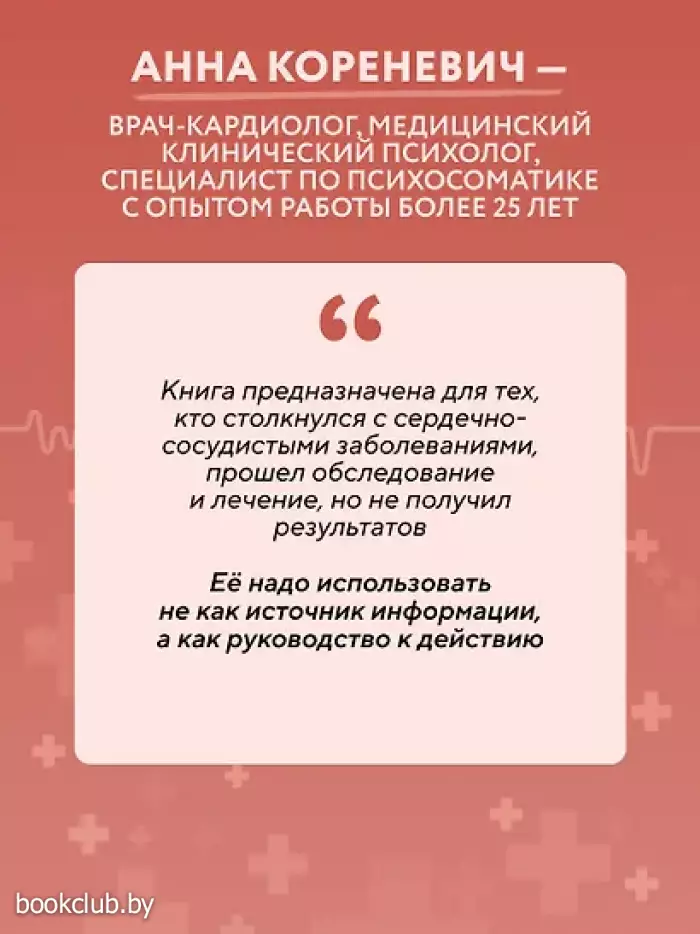 Книга от опытного врача-кардиолога и медицинского клинического психолога Анны Кореневич поможет вам узнать, почему хронический стресс — это скрытый и при этом опаснейший враг сердечно-сосудистой системы и почему справиться с ним можно лишь работая с собственным подсознанием.