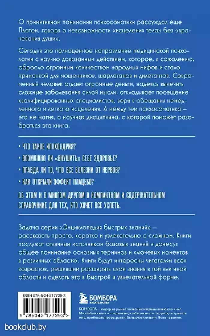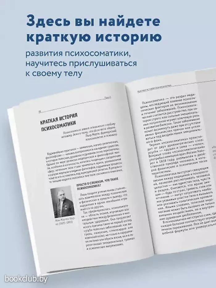Эта книга поможет разобраться в том, как связаны ваше тело и психика. В ней вы найдете краткую историю развития психосоматики, узнаете о связанных с ней мифах и заблуждениях, научитесь прислушиваться к своему телу. Особое внимание в книге уделено стрессу — главному врагу современного человека. Ведь от того, как вы с ним справляетесь, зависит ваше здоровье, энергия и качество жизни. Также в книге можно найти доказательные практические подходы, помогающие справиться со стрессом и наладить более гармоничные отношения между собой и своим телом.