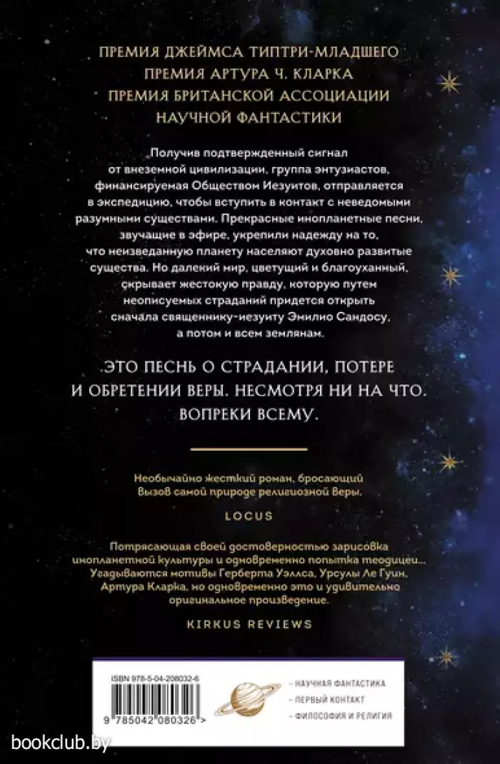 Двадцать первый век. Наконец доказано, что инопланетная жизнь существует. Радиотелескоп в Пуэрто-Рико поймал сигналы с планеты Ракхат — звуки дивного пения... В ООН ведутся бесконечные переговоры о возможном контакте — а орден иезуитов меж тем не медлит и спешно снаряжает собственную научную экспедицию из восьми человек. Взгляду иезуитов откроется совершенно новый мир. Непостижимый настолько, что они усомнятся: что есть "человек".