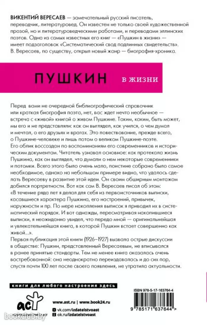 Перед вами не очередной библиографический справочник, или краткая биография поэта, нет, вас ждет нечто необычное – встреча с "живой" книгой о живом Пушкине. Таким, каким быть может мы его и не представляли: как он выглядел, как учился, о чем думал и мечтал, о его друзьях и врагах. Это повествование прежде всего, о Пушкине-человеке и лишь потом о великом Пушкине-поэте. Его облик воссоздан по воспоминаниям его современников и историческим документам. Читатель узнавал основное: как протекала жизнь Пушкина, как он выглядел, что думали о нем некоторые современники и потомки. Всего этого было очень мало, поистине собрано было самое необходимое, однако на небольшом примере видно, что удалось сделать Вересаеву в развитие этой идеи. Он своим обширным монтажом добился портретности. Вот, как сам В. Вересаев писал об этом: "В течение ряда лет я делал для себя из первоисточников выписки, касавшиеся характера Пушкина, его настроений, привычек, наружности и пр. По мере накопления выписок я приводил их в систематический порядок. И вот однажды, пересматривая накопившиеся выписки, я неожиданно увидел, что передо мной – оригинальнейшая и увлекательнейшая книга, в которой Пушкин встает совершенно как живой…" В. Вересаев
