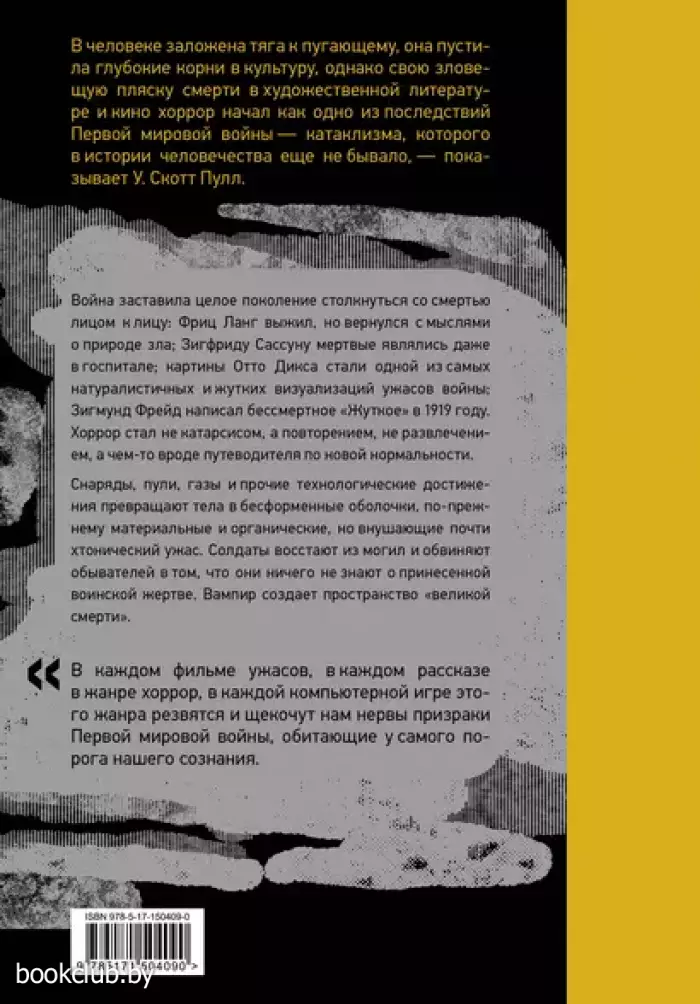 В человеке заложена тяга к пугающему, она пустила глубокие корни в культуру, однако свою зловещую пляску смерти в художественной литературе и кино хоррор начал как одно из последствий Первой мировой войны — катаклизма, которого в истории человечества еще не бывало, — показывает У. Скотт Пулл.