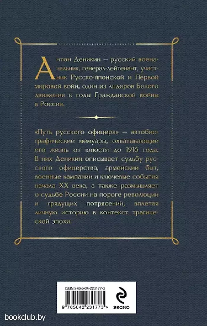 «Путь русского офицера» — автобиографические мемуары, охватывающие его жизнь от юности до 1916 года. В них Деникин описывает судьбу русского офицерства, армейский быт, военные кампании и ключевые события начала XX века, а также размышляет о судьбе России на пороге революции и грядущих потрясений, вплетая личную историю в контекст трагической эпохи.