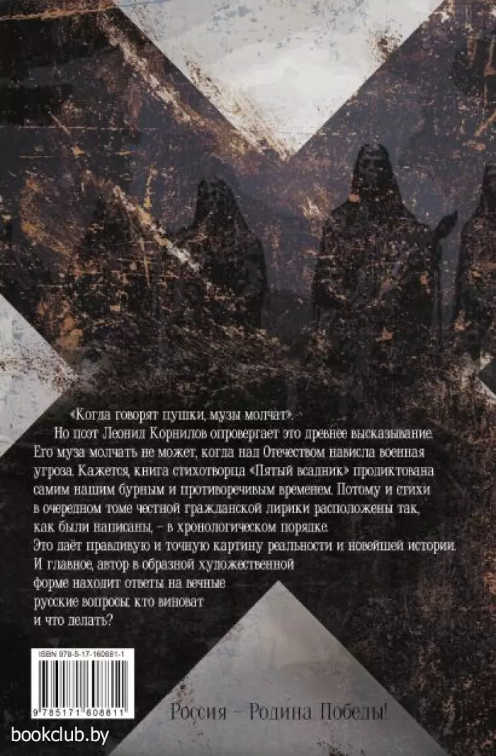 Но поэт Леонид Корнилов опровергает это древнее высказывание. Его муза молчать не может, когда над Отечеством нависла военная угроза. Кажется, книга стихотворца "Пятый всадник" продиктована самим нашим бурным и противоречивым временем. Поэтому и стихи в очередном томе честной гражданской лирики расположены так, как были написаны, — в хронологическом порядке. Это дает правдивую и точную картину реальности и новейшей истории. И главное, автор в образной художественной форме находит ответы на вечные русские вопросы: кто виноват и что делать?