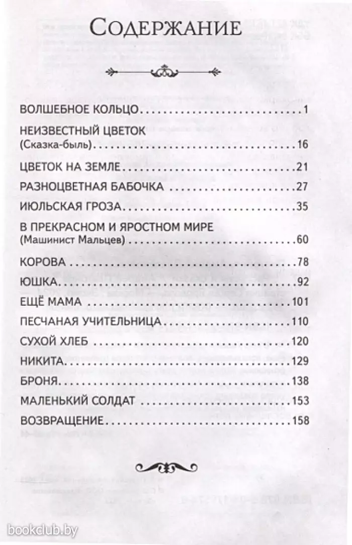 Книга содержит такие произведения, как «Волшебное кольцо», «Юшка», «Корова», «Сухой хлеб» и другие. Страницы дополняют светлые, выразительные иллюстрации Сергея Ярового.
