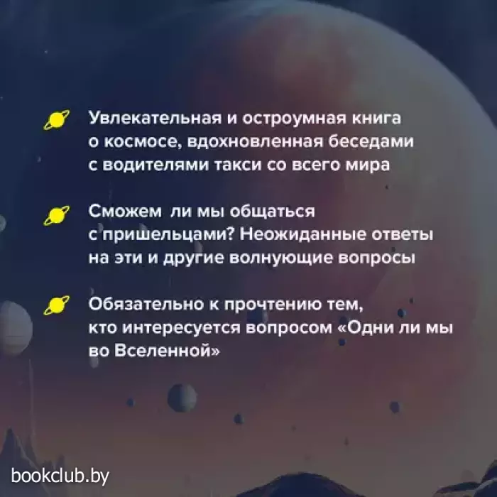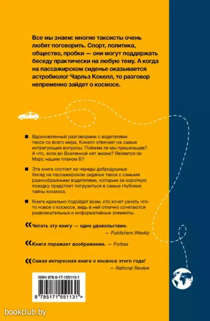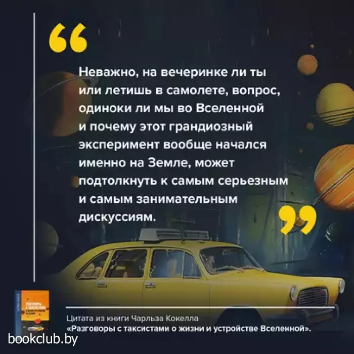 Погружаясь в тему космоса, необязательно обременять себя вагоном академических знаний. Знаменитый астробиолог Чарльз Кокелл так полюбил разговаривать с таксистами о космосе, что собрал целый сборник бесед – забавных, остроумных и увлекательных. Оказалось, что таксисты – те еще философы и знатоки человеческих душ. А что они думают об устройстве Вселенной, инопланетянах, освоении Марса и смысле жизни?
