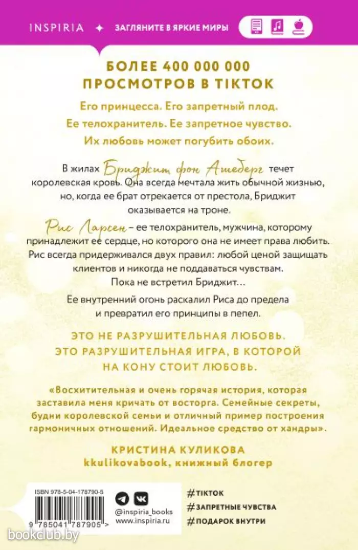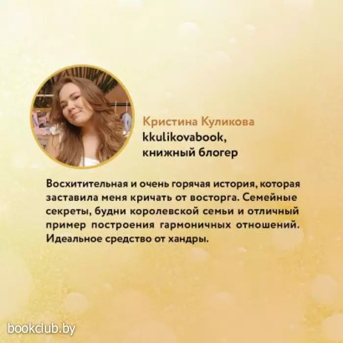 «Восхитительная и очень горячая история, которая заставила меня кричать от восторга. Семейные секреты, будни королевской семьи и отличный пример построения гармоничных отношений. Идеальное средство от хандры». — Кристина Куликова (kkulikovabook), книжный блогер