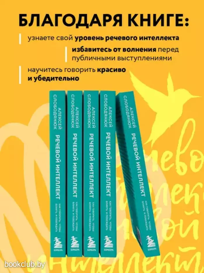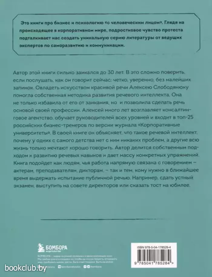 Автор этой книги сильно заикался до 30 лет. В это сложно поверить, если послушать, как он говорит сейчас: четко, уверенно, без малейших запинок. Овладеть искусством красивой речи Алексею Слободянюку помогла собственная методика развития речевого интеллекта. Она не только избавила от его от заикания, но и позволила сделать речь – основой своей профессии. Алексей много лет возглавляет консалтинговое агентство, обучает руководителей всех уровней и входит в топ-25 российских бизнес-тренеров, по версии журнала ""Корпоративные университеты"". В своей книге он объясняет, что такое речевой интеллект, почему у одних с самого детства нет с ним никаких проблем, а другие всю жизнь только мечтают хорошо говорить. Автор делится собственным подходом к развитию речевых навыков и дает массу конкретных упражнений. Книга подойдет как людям, чья работа напрямую связана с говорением – актерам, преподавателям, дикторам, – так и тем, кому нужно ближайшее время выдержать испытание публичной речью. Например, сдать устный экзамен, выступить на совете директоров или сказать тост на юбилее.