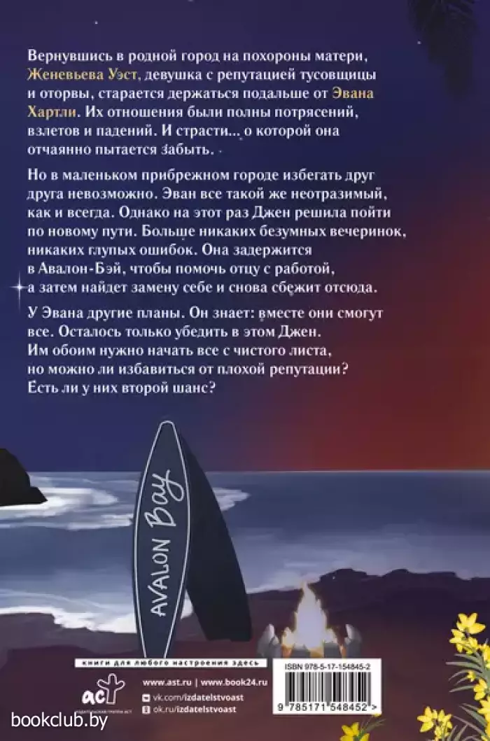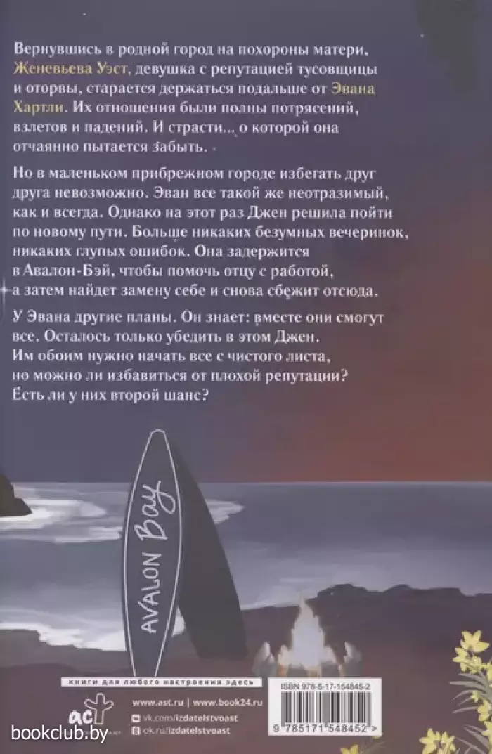 Вернувшись в родной город на похороны матери, Женевьева Уэст, девушка с репутацией тусовщицы и оторвы, старается держаться подальше от Эвана Хартли. Их отношения были полны потрясений, взлетов и падений. И страсти… о которой она отчаянно пытается забыть. Но в маленьком прибрежном городе избегать друг друга невозможно. Эван все такой же неотразимый, как и всегда. Однако на этот раз Джен решила пойти по новому пути. Больше никаких безумных вечеринок, никаких глупых ошибок. Она задержится в Авалон-Бэй, чтобы помочь отцу с работой, а затем найдет замену себе и снова сбежит отсюда. У Эвана другие планы. Он знает: вместе они могут все. Осталось только убедить в этом Джен. Им обоим нужно начать все с чистого листа, но можно ли избавиться от плохой репутации? Есть ли у них второй шанс?