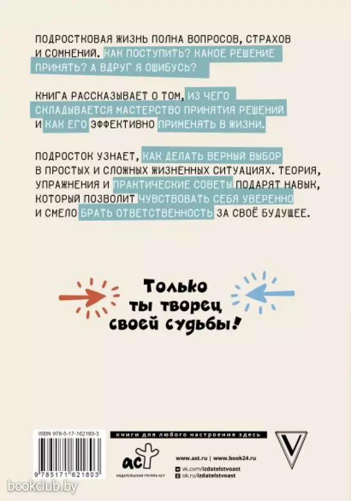 Книга рассказывает о том, из чего складывается навык принятия решений и как им эффективно пользоваться в жизни. Подросток узнает, как делать верный выбор в простых и сложных жизненных ситуациях. Теория, упражнения, практические советы и подарят навык, который позволит чувствовать себя уверенно и смело брать ответственность за своё будущее.