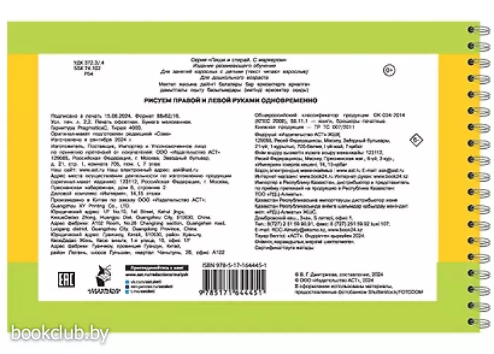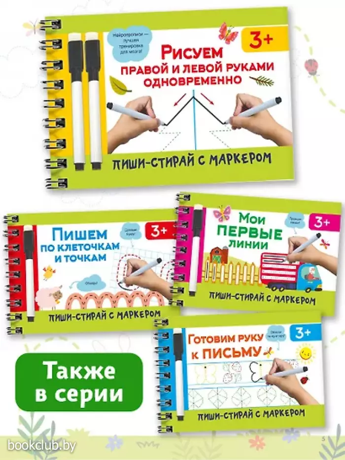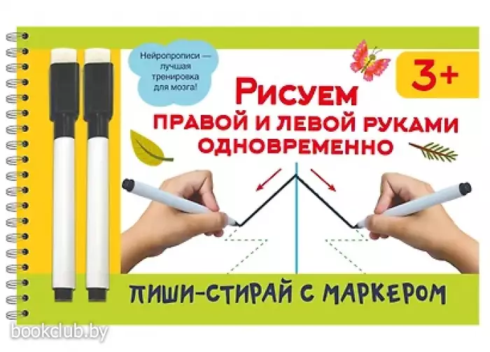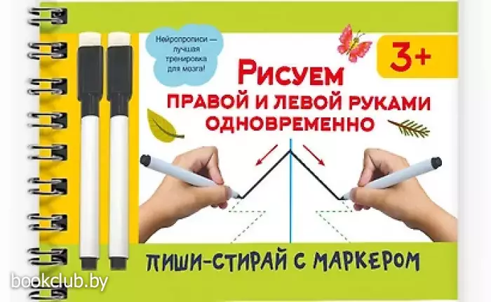 "Рисуем правой и левой руками одновременно" — удобный и полезный многоразовый рабочий блокнот, в котором можно писать, рисовать и стирать хоть 100 раз! Плотная мелованная бумага и глянцевые ламинированные страницы делают книгу не только привлекательной, но и долговечной. В комплекте — 2 маркера на водной основе. В книге собраны занимательные задания, цель которых — наладить согласованное взаимодействие правого и левого полушарий мозга, благодаря чему ребёнок станет более внимательным и усидчивым, улучшит свою память, речь, мелкую моторику и координацию движений. Книгу можно использовать дома, на занятиях в детском саду и даже в дороге.