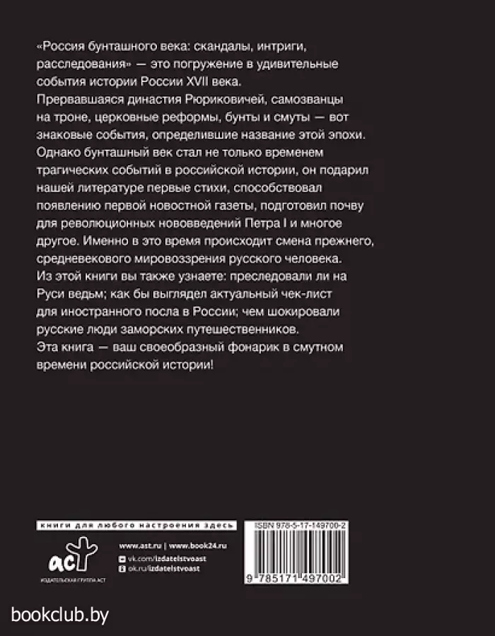 Это погружение в удивительные события истории России XVII века. Прервавшаяся династия Рюриковичей, самозванцы на троне, церковные реформы, бунты и смуты — вот знаковые события, определившие название этой эпохи. Однако бунташный век стал не только временем трагических событий в российской истории, он подарил нашей литературе первые стихи, способствовал появлению первой новостной газеты, подготовил почву для революционных нововведений Петра I и многое другое. Именно в это время происходит смена прежнего, средневекового мировоззрения русского человека. Эта книга — ваш своеобразный фонарик в смутном времени российской истории!
