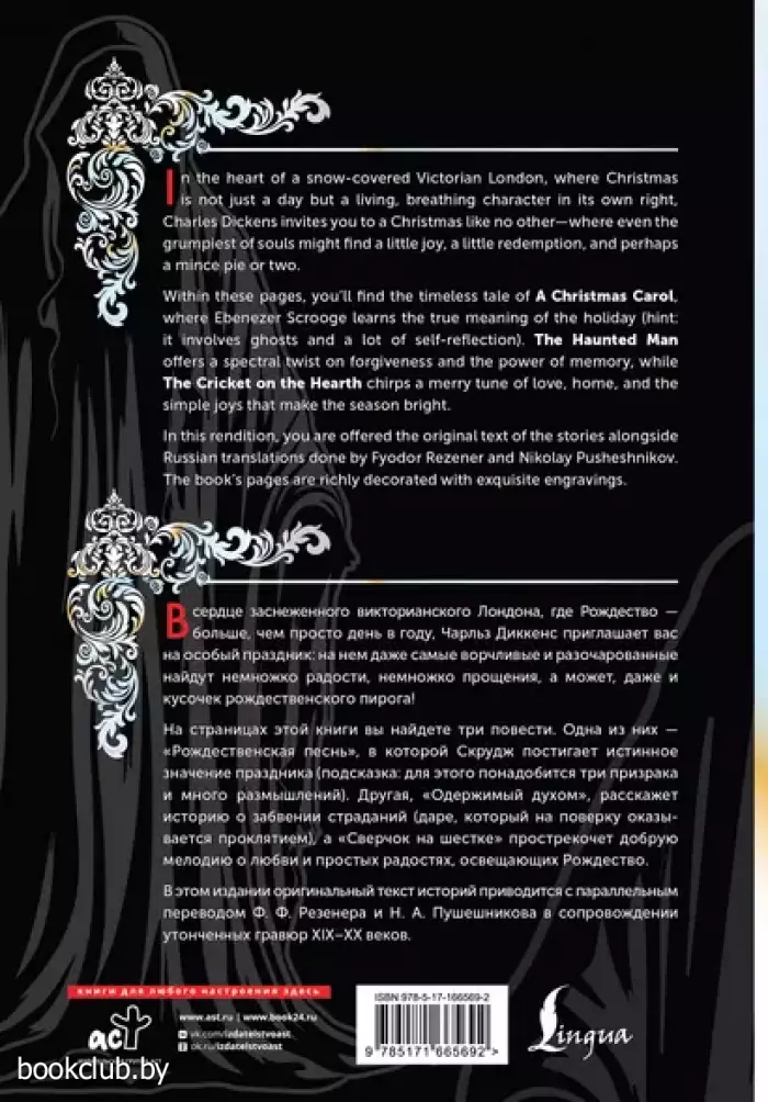 Начав искать идеальный рецепт волшебной зимней книги, мы взяли вечернюю снежную улицу старого Лондона, добавили к ней щедрую порцию викторианского очарования, щепотку мерцающих огоньков на елках, сдобрили все это остроумием Чарльза Диккенса и дали настояться в атмосфере добра и прощения — так мы получили этот праздничный сборник. В нем каждая история пропитана мягким юмором и душевным теплом, как изысканный пирог, замешанный на радости и домашнем уюте. «Рождественская песнь в прозе» — его основа: мрачный Скрудж, варящийся в собственном соку, внезапно открывает для себя радость щедрости и любви. «Сверчок на шестке» — хрустящий рождественский крекер, наполненный домашним уютом и семейным счастьем, а «Одержимый духом» — пикантное угощение с привкусом тайн и прощения, оставляющее долгое и теплое послевкусие. Мы подаем эти истории вместе с их русскими переводами, заботливо выполненными Федором Федоровичем Резенером и Николаем Алексеевичем Пушешниковым, на страницах, украшенных изысканными гравюрами. Для удобства чтения русский текст расположен параллельно с английским, что позволит без труда сравнивать оригинал с переводом, обращать внимание на трудности, с которыми сталкивался переводчик, и отмечать наиболее точно переведенные фрагменты. Обложка книги дополнена переливающейся, словно замерзшее окошко, голографической фольгой и приятна на ощупь благодаря контрасту матовых и глянцевых поверхностей. Ленточка ляссе поможет не потерять страницу, отвлекшись на приготовления к празднику и время с близкими. Книгу можно приобрести не только для своей коллекции, но и в качестве подарка дорогим и близким людям на Рождество, Новый год или день рождения.
