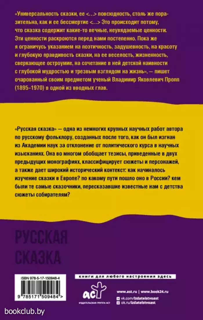 «Русская сказка», не оконченная автором рукопись, во многом обобщает тезисы, приведенные в двух предыдущих монографиях, но также и распространяет их. Работа классифицирует сюжеты и персонажей, а также дает широкий исторический контекст: как начиналось изучение сказки в Европе? по какому пути пошло оно в России? кем были те самые сказочники, пересказавшие известные нам с детства сюжеты собирателям?