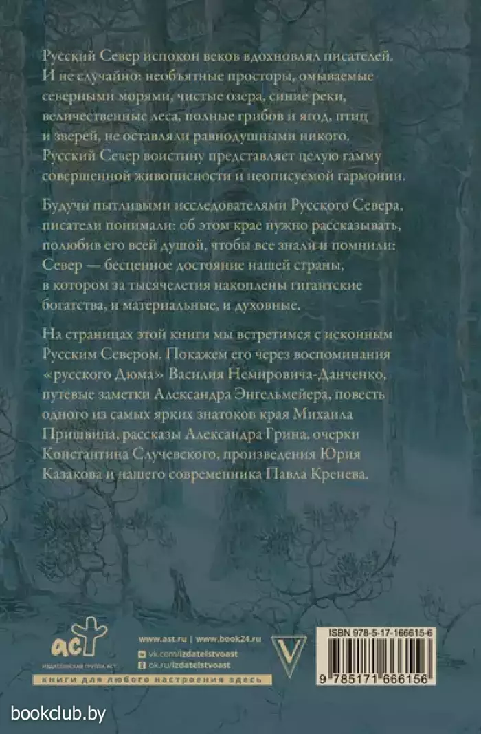 Русский Север испокон веков вдохновлял писателей. И не случайно: необъятные просторы, омываемые северными морями, чистые озера, синие реки, величественные леса, полные грибов и ягод, птиц и зверей, не оставляли равнодушными никого. Русский Север воистину представляет целую гамму совершенной живописности и неописуемой гармонии. Будучи пытливыми исследователями Русского Севера, писатели понимали: об этом крае нужно рассказывать, полюбив его всей душой, чтобы все знали и помнили: Север — бесценное достояние нашей страны, в котором за тысячелетия накоплены гигантские богатства, и материальные, и духовные. На страницах этой книги мы встретимся с исконным Русским Севером. Покажем его через воспоминания «русского Дюма» Василия Немировича-Данченко, путевые заметки Александра Энгельмейера, повесть одного из самых ярких знатоков края Михаила Пришвина, рассказы Александра Грина, очерки Константина Случевского, произведения Юрия Казакова и нашего современника Павла Кренева.
