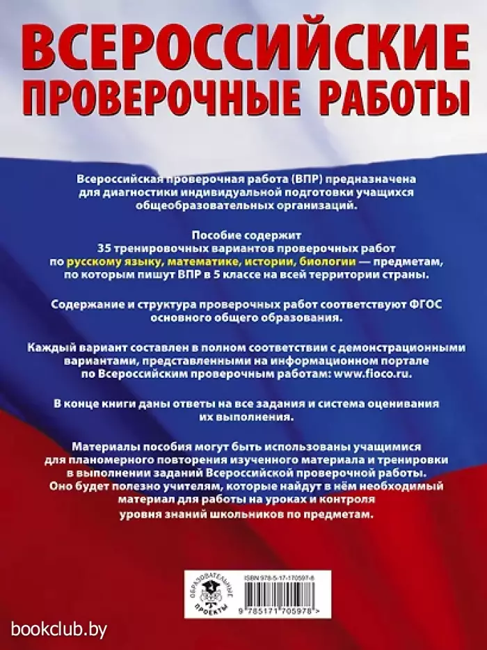 Данное пособие предназначено для учащихся 5 классов общеобразовательных организаций. Оно позволяет в кратчайшие сроки проверить свои знания, потренироваться в выполнении заданий и тем самым успешно подготовиться к выполнению Всероссийской проверочной работы по итогам обучения в течение года. Пособие содержит 35 тренировочных вариантов проверочных работ по русскому языку, математике, истории и биологии — предметам, по которым пишут ВПР в 5 классе на всей территории страны.