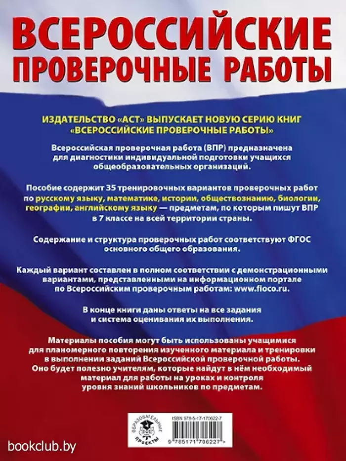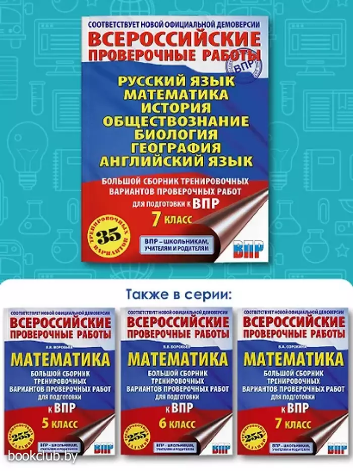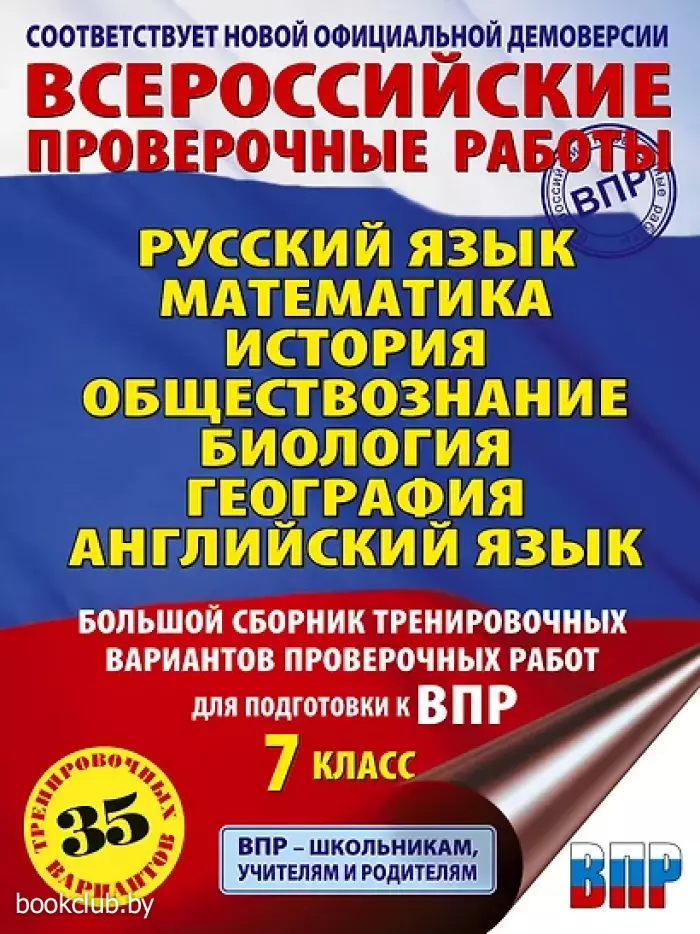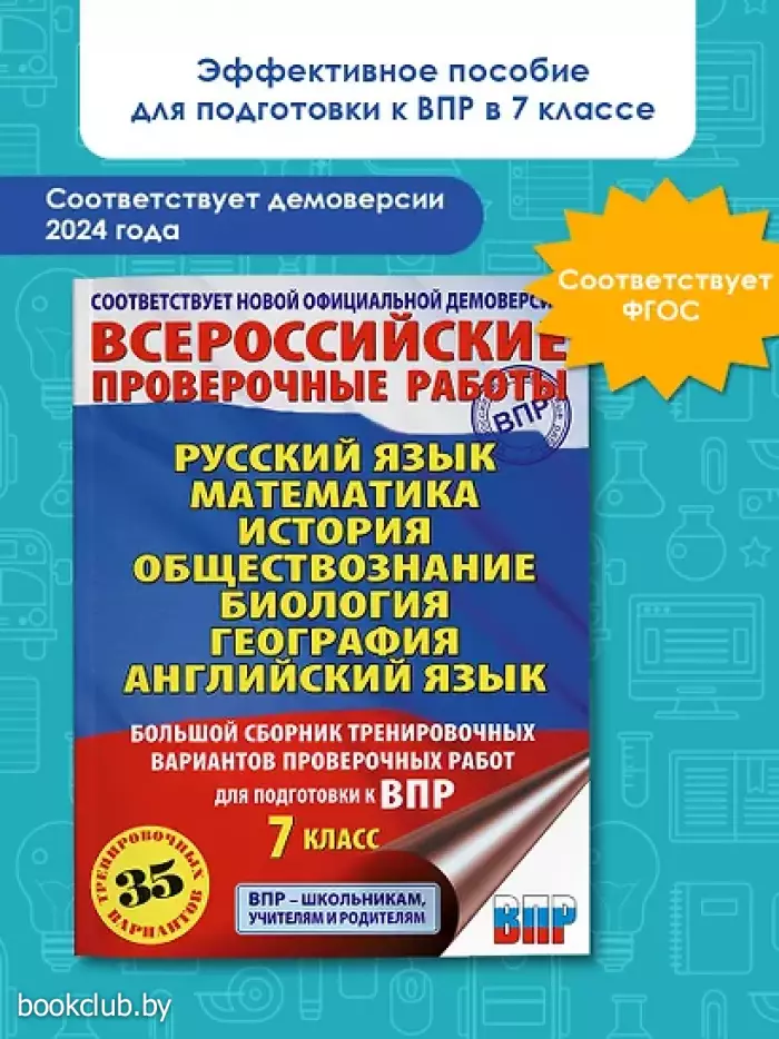 Оно позволяет в кратчайшие сроки проверить свои знания, потренироваться в выполнении заданий и тем самым успешно подготовиться к выполнению Всероссийских проверочных работы по итогам обучения в течение года. Пособие содержит 35 тренировочных вариантов проверочных работ по РУССКОМУ ЯЗЫКУ, МАТЕМАТИКЕ, ИСТОРИИ, ОБЩЕСТВОЗНАНИЮ, БИОЛОГИИ, ГЕОГРАФИИ И АНГЛИЙСКОМУ ЯЗЫКУ — предметам, по которым пишут ВПР в 7 классе на всей территории страны.