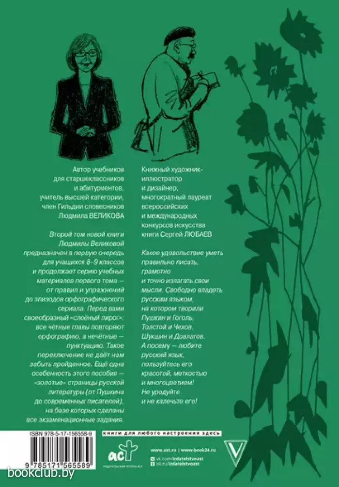 Второй том новой книги Людмилы Великовой предназначен в первую очередь для учащихся 8–9 классов и продолжает серию учебных материалов первого тома – от правил и упражнений до эпизодов орфографического сериала. Перед вами своеобразный "слоёный пирог": все чётные главы повторяют орфографию, а нечётные — пунктуацию. Такое переключение не даёт нам забыть пройденное. Ещё одна особенность этого пособия — "золотые" страницы русской литературы (от Пушкина до современных писателей), на базе которых сделаны все экзаменационные задания. Известно, что именно девятый класс подводит итоги программы по русскому языку за весь курс средней школы, поэтому эту книгу можно смело рекомендовать всем заинтересованным в совершенствовании своих знаний по орфографии и пунктуации.