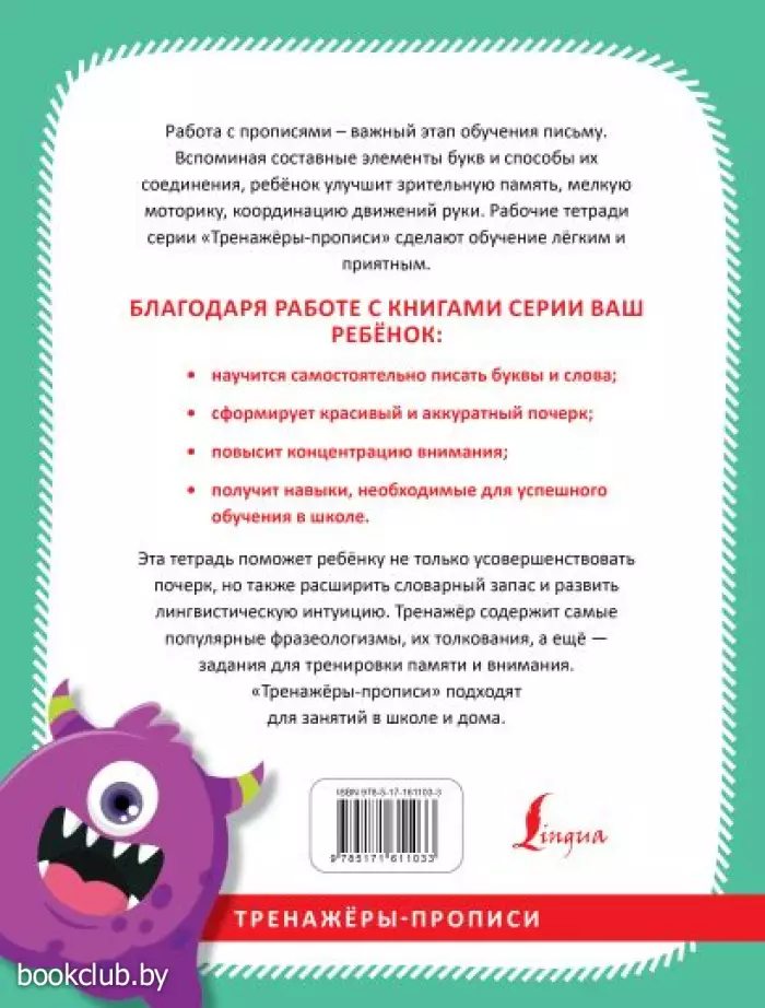 Эти прописи познакомят ребёнка с самыми ходовыми фразеологизмами и станут отличным тренажёром разборчивого, красивого почерка.