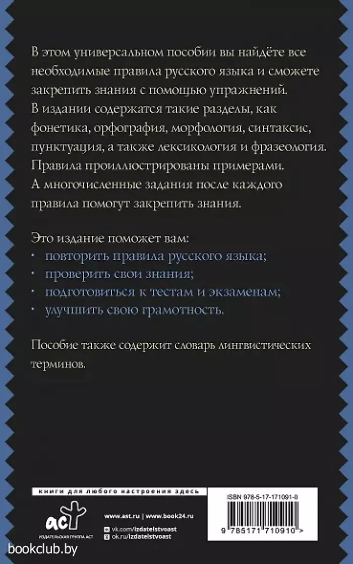 В этом универсальном пособии вы найдёте все необходимые правила русского языка. Полный курс грамматики, охватывающий такие разделы, как фонетика, орфография, морфология, синтаксис, пунктуация, а также лексикология и фразеология. Правила проиллюстрированы примерами, а многочисленные задания после каждого правила помогут закрепить знания. Пособие включает словарь лингвистических терминов.
