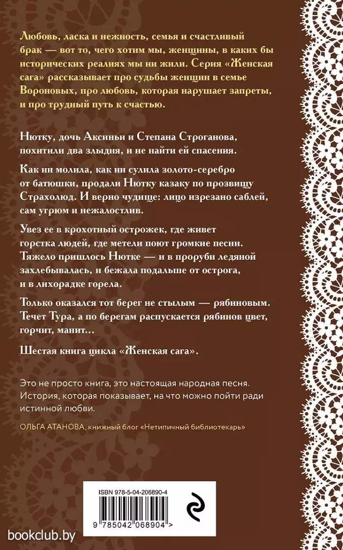 Нютку, дочь Аксиньи и Степана Строганова, похитили два злыдня, и не найти ей спасения.Как ни молила, как ни сулила золото-серебро от батюшки, продали Нютку казаку по прозвищу Страхолюд. И верно чудище: лицо изрезано саблей, сам угрюм и нежалостлив.Увез ее в крохотный осторожек, где живет горстка людей, где метели поют громкие песни. Тяжело пришлось Нютке — и в проруби ледяной захлебывалась, и бежала подальше от острога, и в лихорадке горела.Только оказался тот берег не стылым — рябиновым. Течет Тура, а по берегам распускается рябинов цвет, горчит, манит...
