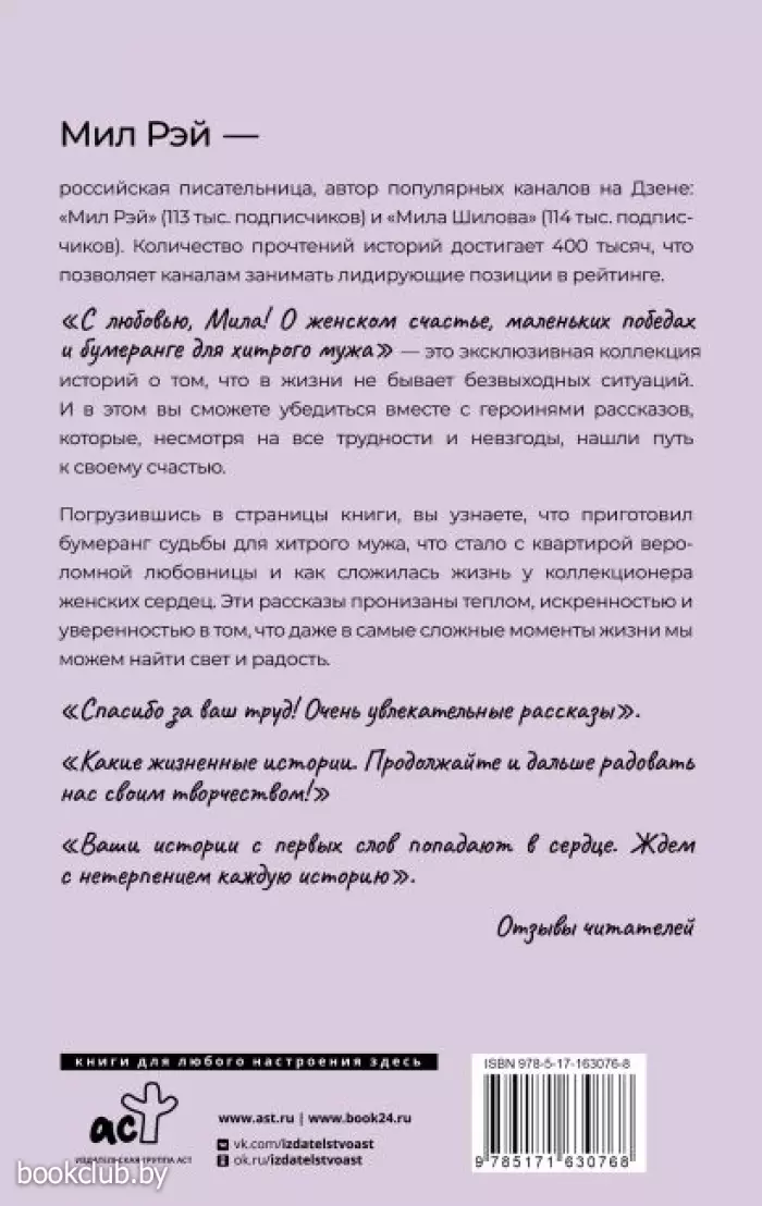 "С любовью, Мила! О женском счастье, маленьких победах и бумеранге для хитрого мужа" – это эксклюзивная коллекция историй о том, что в жизни не бывает безвыходных ситуаций. И в этом вы сможете убедиться вместе с героинями рассказов, которые, несмотря на все трудности и невзгоды, нашли путь к своему счастью.
