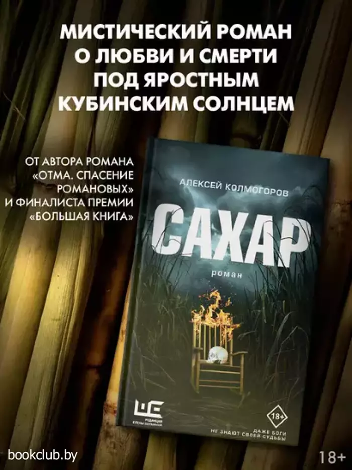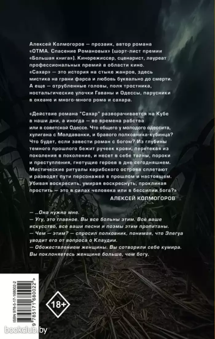 Алексей Колмогоров — прозаик, автор романа «ОТМА. Спасение Романовых» (шорт-лист премии «Большая книга»). Кинорежиссер, сценарист, лауреат профессиональных премий в области кино. «Сахар» — это история на стыке жанров, здесь мистика на грани фарса и любовь буквально до смерти. А еще — отрубленные головы, поля тростника, ностальгические улочки Гаваны и Одессы, парусники в океане и много-много рома и сахара «Действие романа “Сахар” разворачивается на Кубе в наши дни, а иногда — во времена рабства, или в советской Одессе. Что общего у молодого одессита, хулигана с Молдаванки, и бравого полковника-кубинца? Что будет, если завести роман с богом? Из глубины темного прошлого бежит ручеек крови, перетекая из поколения в поколение, и несет в себе тайны, пороки и преступления, гнетущие героев в дне сегодняшнем. Мистические ритуалы карибского острова сплетают и разводят пути персонажей в прошлом и настоящем. Убивая воскресить, умирая воскреснуть, проклиная простить — это в силах человека или в бессилии бога?» (Алексей Колмогоров) — …Она нужна мне. — Угу, это главное. Вы все больны этим. Всё ваше искусство, все ваши песни и поэмы этим пропитаны. — Чем — этим? — спросил полковник, понимая, что Элегуа уводит его от вопроса о Клаудии. — Обожествлением женщины. Вы сотворили себе кумира. Вы поклоняетесь женщине больше, чем богу.