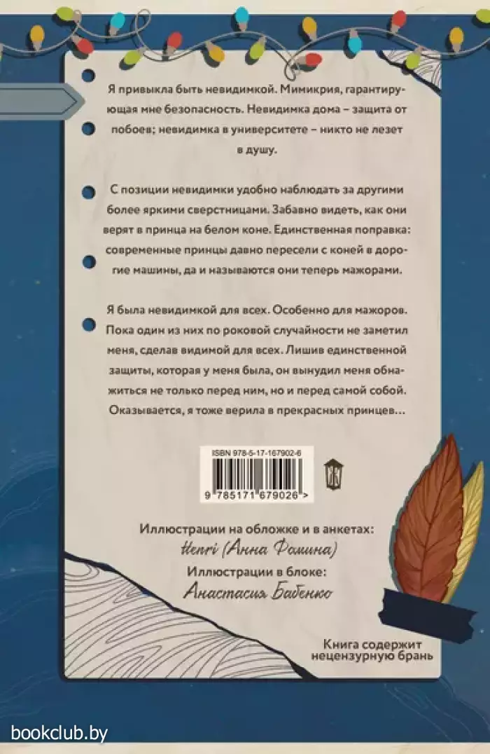 Я привыкла быть невидимкой. Мимикрия, гарантирующая мне безопасность. Невидимка дома – защита от побоев; невидимка в университете – никто не лезет в душу. С позиции невидимки удобно наблюдать за другими, более яркими сверстницами. Забавно видеть, как они верят в принца на белом коне. Единственная поправка: современные принцы давно пересели с коней в дорогие машины, да и называются они теперь мажорами. Я была невидимкой для всех. Особенно для мажоров. Пока один из них по роковой случайности не заметил меня, сделав видимой для всех. Лишив единственной защиты, которая у меня была, он вынудил меня обнажиться не только перед ним, но и перед самой собой. Оказывается, я тоже верила в прекрасных принцев…