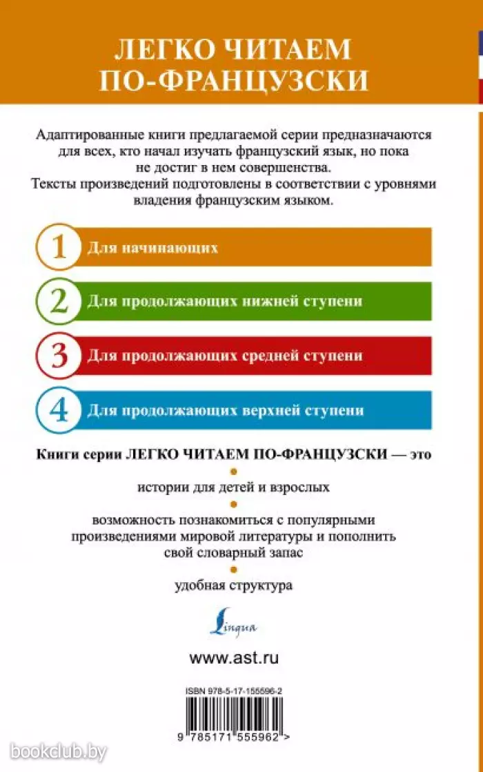 Книга от издательства «АСТ», входящая в серию «Легко читаем по-французски», принесет массу положительных впечатлений от прочтения и займет достойное место в вашей библиотеке. Для вашего удобства при оформлении заказа по телефону назовите код товара: 195739