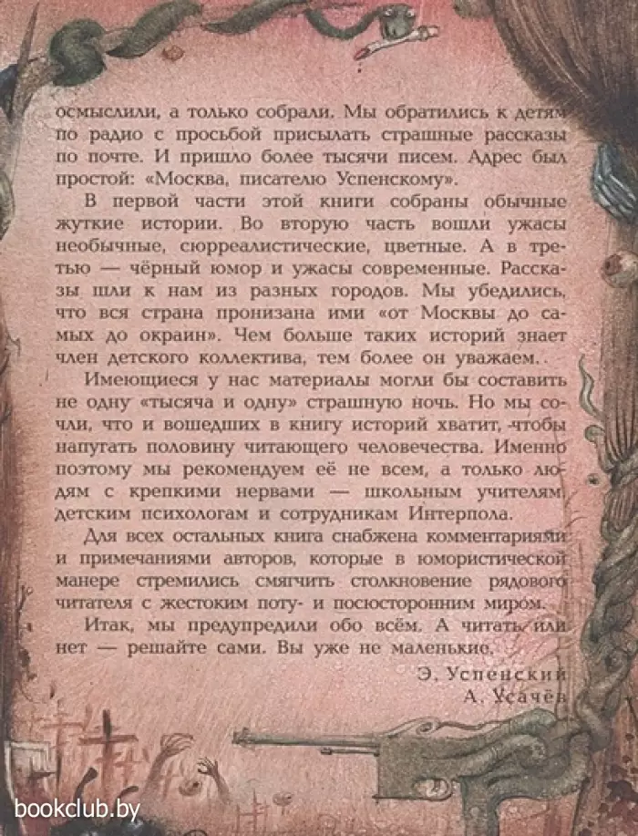 «Как появилась и возникла эта книга? Авторы посвятили сбору и осмыслению этого материала несколько лет жизни. Но, по правде говоря, ничего не осмыслили, а только собрали. Мы обратились к детям по радио с просьбой присылать страшные рассказы по почте. И пришло более тысячи пи¬сем…» Так об истории создания этого уникального цикла рассказывали авторы-составители Эдуард Успенский и Андрей Усачёв. Писателям было очень интересно понять, почему эти жуткие рассказы так привлекательны для детей. Попробуйте разобраться в этом и вы с помощью этой книги!