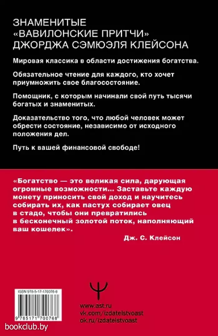 Перед вами — мировая классика в области достижения богатства. Обязательна к прочтению для каждого, кто хочет приумножить свое благосостояние, Помощник, с которым начинали свой путь тысячи богатых и знаменитых. Знаменитые «Вавилонские притчи» Джорджа Клейсона — величайшее из всех вдохновляющих произведений на тему финансового планирования и личного богатства, это Библия процветания, которая будет поддерживать вас на протяжении всей жизни. Эта книга — путь к вашей финансовой свободе!