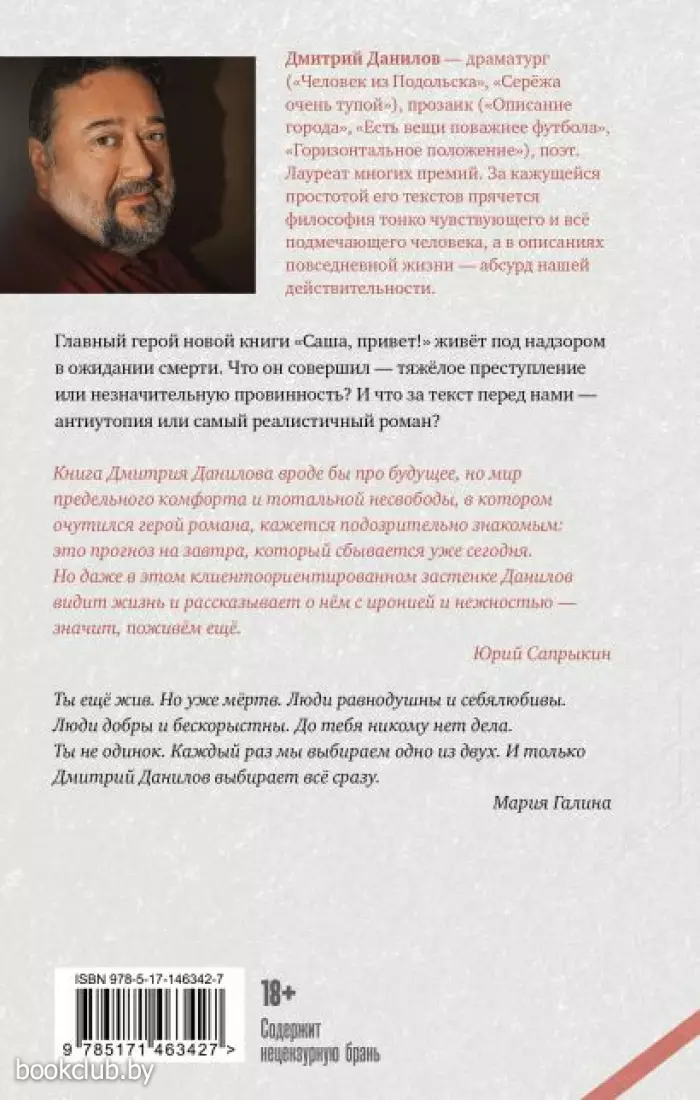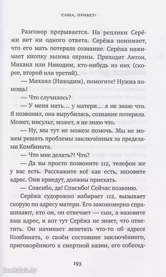 «Саша, привет!» – удивительный по структуре роман, состоящий из 82 эпизодов жизни человека, приговоренного к заключению в Комбинате исполнения наказаний и смертной казни.