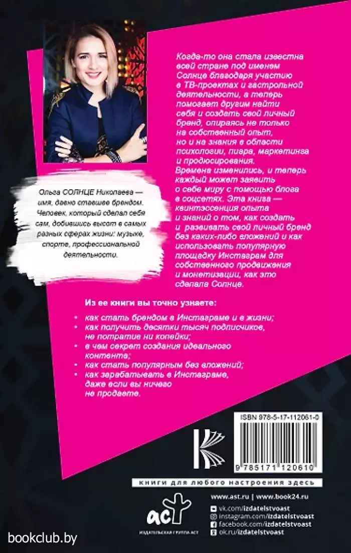 Ольга СОЛНЦЕ Николаева — имя, давно ставшее брендом. Человек, который сделал себя сам, добившись высот в самых разных сферах жизни: музыке, спорте, профессиональной деятельности. Когда-то она стала известна всей стране под именем Солнце благодаря участию в ТВ-проектах и гастрольной деятельности, а теперь помогает другим найти себя и создать свой личный бренд, опираясь не только на собственный опыт, но и на знания в области психологии, пиара, маркетинга и продюсирования..Времена изменились, и теперь каждый может заявить о себе миру с помощью блога в соцсетях. Эта книга — квинтэссенция опыта и знаний о том, как создать и развивать свой личный бренд без каких-либо вложений и как использовать популярную площадку Инстаграм для собственного продвижения и монетизации, как это сделала Солнце. .Из ее книги вы точно узнаете:.· как стать брендом в Инстаграме и в жизни;.· как получить десятки тысяч подписчиков, не потратив ни копейки;.· в чем секрет создания идеального контента;.· как стать популярным без вложений;.· как зарабатывать в Инстаграме, даже если вы ничего не продаете. .