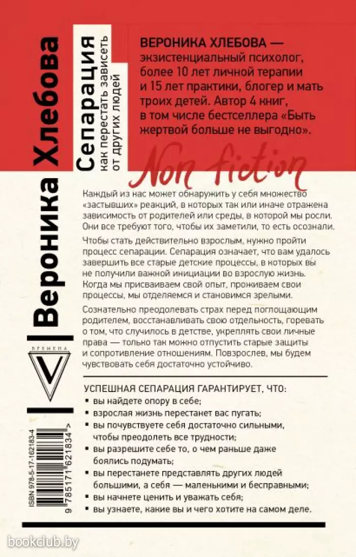 "Если представить психологические проблемы человека в виде метафорического клубка размером с футбольный мяч, то проблема сепарации — из тех ниточек, за которые стоит потянуть, чтобы весь клубок распутать. Вероника Хлебова ненавязчиво указывает читателю, как правильно за эту ниточку тянуть, не множа хаос, а реально решая проблемы. "Тяните аккуратно, в вашем темпе, без оглядки на окружающих", — говорит она своей книгой. И когда клубок начнет распутываться, вы заметите, как и с близкими отношения налаживаются, и с нелюбимой работы уйти удается, и вообще — мечты начинают сбываться". © Александр Акулиничев, главный редактор сайта Psychologies.ru