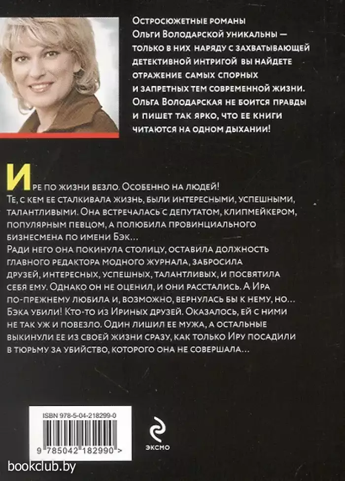 Романы Ольги Володарской — остросоциальные детективы, в которых автор препарирует все стороны жизни современного общества, ничего не скрывая и ни о чем не умалчивая. Ее книги написаны так увлекательно, что оторваться просто невозможно. Яркий сочный язык и блестящий авторский стиль создают неповторимую атмосферу, в которую с головой погружается читатель.