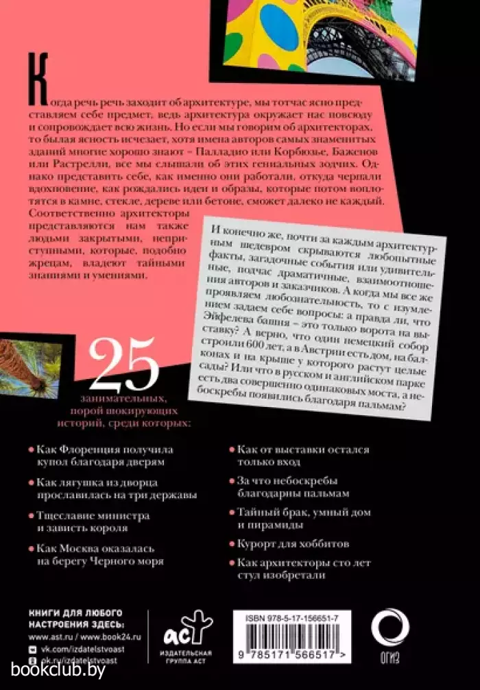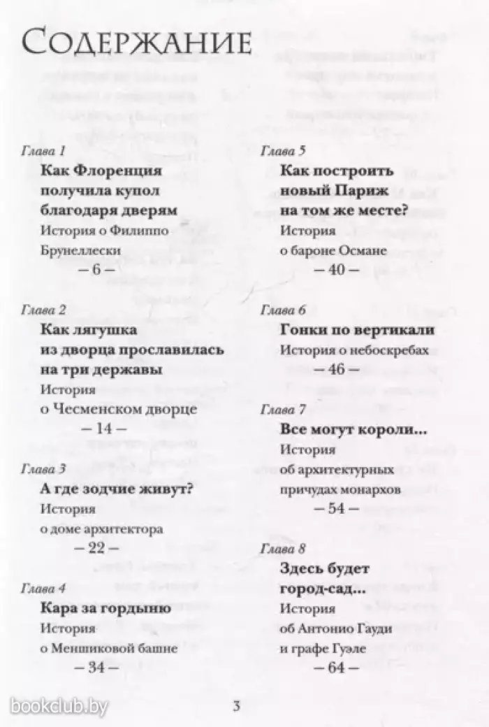 И конечно же, почти за каждым архитектурным шедевром скрываются любопытные факты, загадочные события или удивительные, подчас драматичные, взаимоотношения авторов и заказчиков. А когда мы все же проявляем любознательность, то с изумлением задаем себе вопросы, а правда ли, что Эйфелева башня – это только ворота на выставку? А верно, что в честь обычной лягушки был назван дворец и создан сервиз? И действительно, что один немецкий собор строили 600 лет, а в Австрии есть дом, на балконах и на крыше у которого растут целые сады? Или что в русском и английском парке есть два совершенно одинаковых моста, а небоскребы появились благодаря пальмам?